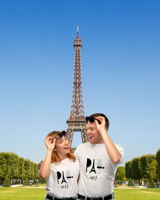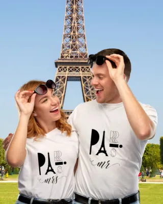 👕 Camisetas a juego para parejas, con Diseño inspirado en París, ideal para viajes de Luna de Miel. 🇫🇷 Diseño Mr y Mrs con Torre Eiffel. - Estampado en color negro sobre fondo blanco. - Disponible todas las tallas