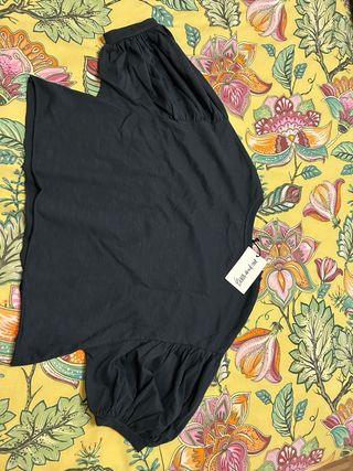Camiseta/blusa marca compañía fantástica,sin usar, color azul estampado de flores, cuello bobo con cordón ajustable, talla xs ancho 46 cm, largo 58 cm, 100% viscosa.