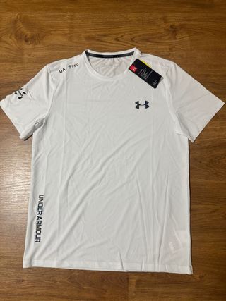 Camiseta deportiva de manga corta Under Armour. - Diseño en color blanco. - Logo de Under Armour en el pecho. - Inscripción UA-SPEC en la manga. - Inscripción UNDER ARMOUR en la parte inferior lateral. talla M y L