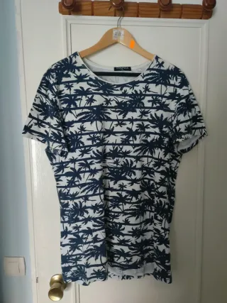 Camiseta de manga corta con un llamativo estampado de palmeras en tonos azules y blancos. Perfecta para un look veraniego y casual. - Diseño de palmeras sobre fondo blanco. - Cuello redondo. - Manga corta.