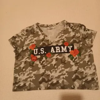 Camiseta corta con estampado de camuflaje y detalle de rosas. - Diseño frontal con texto U.S. ARMY. - Estampado de camuflaje en tonos verdes y rojos. - Adornada con aplicaciones de rosas rojas. - Con medidas de hombros 38 cm y largo 38