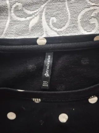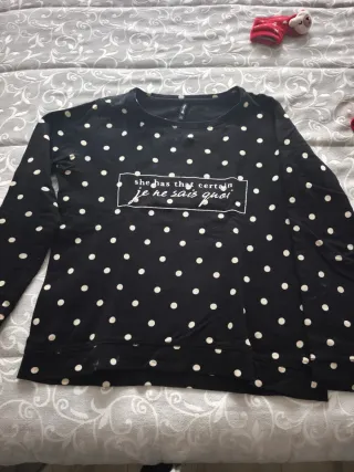 Camiseta de manga larga con un diseño de lunares. - Estampado de lunares blancos sobre fondo negro. - Detalle de texto she has that certain je ne sais quoi en la parte frontal. Talla pequeña, normalmente llevo s/m