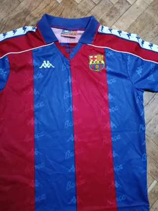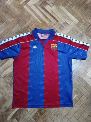 Camiseta de fútbol local vintage del FC Barcelona de la temporada 1993-1994. - Diseño clásico con los colores azulgrana. - Logo de Kappa en las mangas y pecho. - Escudo del F.C.B. bordado.
