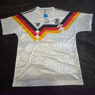 Camiseta clásica de Alemania de la marca Adidas. - Diseño icónico con los colores de la bandera alemana. - Tejido blanco con un patrón sutil. - Logo de Adidas y escudo de la selección alemana.