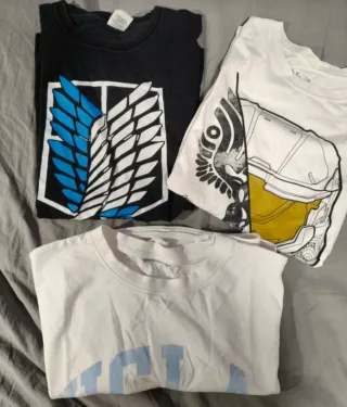Conjunto de tres camisetas. - Camiseta de manga corta. - Cuello redondo. - Tejido de algodón. Camiseta Attack on titán talla M Camiseta Ucla talla L Camiseta Halo Wars talla L