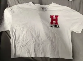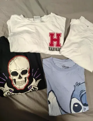 Conjunto de cuatro camisetas variadas. - Camiseta blanca con logo de Harvard. - Camiseta negra con diseño de calavera. - Camiseta azul con personaje de Disney (Stitch). - Camiseta blanca lisa.
