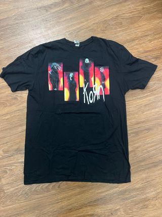 Camiseta de merchandising de Korn, ideal para fans de la banda. - Diseño frontal con imágenes de los miembros de la banda. - Logo de Korn en blanco.