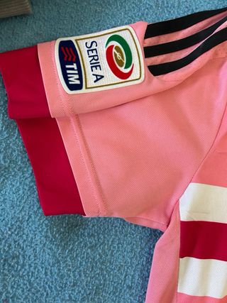 Camiseta retro del Juventus de Turín. - Diseño en color rosa con detalles blancos y negros. - Logo de Adidas y escudo del Juventus. - Parche de la Serie A TIM en la manga.