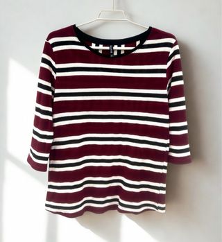 Camiseta de manga tres cuartos de rayas rojas, blancas y negras. Cuello redondo. Talla M, Stradivarius