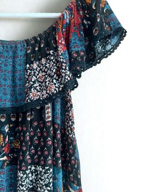 Top camisa étnica de hombros caídos, con estampado multicolor y detalles de encaje. De Stradivarius, talla S