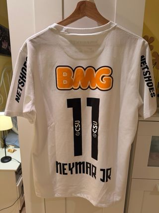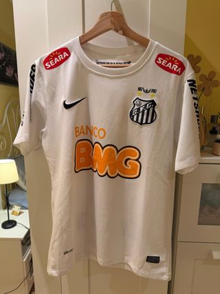 Camiseta del Santos FC. - Diseño blanco con detalles en negro y naranja. - Logo de Nike bordado. - Escudo del club en el pecho. - Inscripción Menina de Ouro en el cuello.