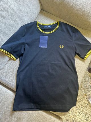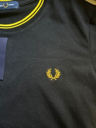 Camiseta de manga corta con cuello redondo y detalles en amarillo, es una M pero es muy estrecha y talla como una S aunque se estira bastante, está nueva con etiqueta, solo trato en mano en Huesca - Logo bordado en el pecho. - Ribetes de contraste en cuello y mangas.