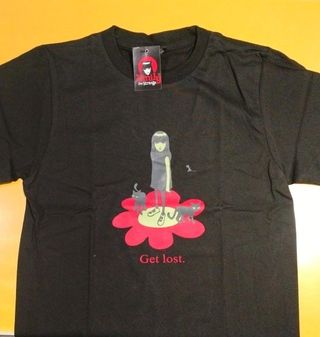 Camiseta manga corta negra con un diseño gráfico de Emily the Strange. No sé ve clamaremnte la talla, pero parece una XS o S - Ilustración de una niña con gatos sobre una flor. - Mensaje Get lost. en la parte inferior.