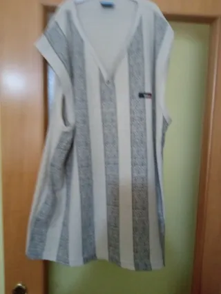 Camiseta de manga larga con un diseño original que combina un tejido gris suave con una parte inferior de rayas azules. - Cuello redondo. - Mangas largas. - Detalle de rayas verticales en azul y blanco en la parte inferior. - Cierre de botones en la parte frontal inferior.