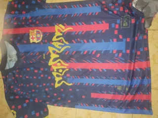 Camiseta del FC Barcelona con un diseño moderno y llamativo. - Diseño con franjas y detalles geométricos. - Escudo del club en el pecho. - Tejido transpirable para mayor comodidad.