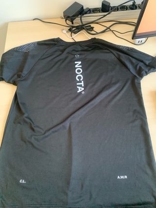 Camiseta deportiva Nike x Nocta en color negro. Presenta un diseño moderno con detalles gráficos en los hombros y un mensaje distintivo en el pecho. - Logo de Nike. - Mensaje SOMETIMES YOU SOMETIMES ME ALWAYS US en el pecho. - Detalles gráficos en los hombros.