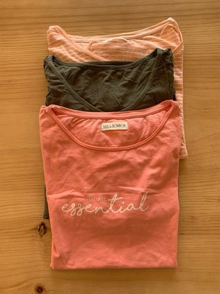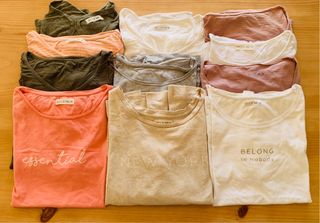 Lote de once camisetas de la marca Mus & Bombon. - Variedad de colores: beige, gris, verde, naranja, rosa y blanco. - Diseño versátil y cómodo. - Talla única para adaptarse a diferentes siluetas.