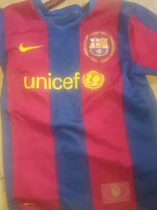 Camiseta del FC Barcelona de la temporada 2007-2008, con el logo de Unicef. - Diseño a rayas rojas y azules. - Logo de Nike bordado. - Escudo del club conmemorativo 1957-2007.