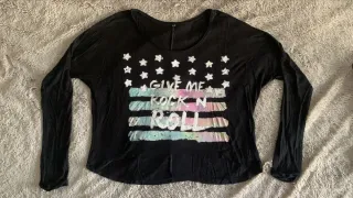Camiseta negra de manga larga con un diseño divertido. - Estrellas blancas decorativas. - Estampado frontal Give me rock n roll con efecto acuarela. - Corte ancho y cómodo. -Talla S