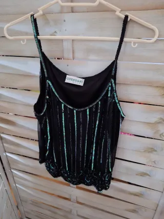 Elegante camiseta de tirantes adornada con pedrería. - Diseño único y llamativo. - Detalle de pedrería vertical. - Base con acabado ondulado y pedrería. - Talla pequeño