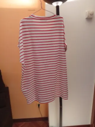 Camiseta de mujer con un diseño de rayas clásicas en rojo y blanco. Es una prenda cómoda y versátil. - Manga corta. - Cuello redondo con ribete. - Tejido de punto. Medidas: hombros 38 cm ,de sisa a sisa 52 '50 cm y largo 56 cm . Composición 50%viscosa 50%poliester.