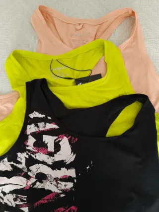 3 camisetas de tirantes mujer, para práctica deportiva: - Diseño de tirantes. - Tejido ligero y transpirable. - Amarilla y Rosa de TALLA S Primark. - Negra de Decathlon TALLA XS. - Son sueltas y largas. - Ideal para zumba, aeróbic! Más artículos en la perfil!