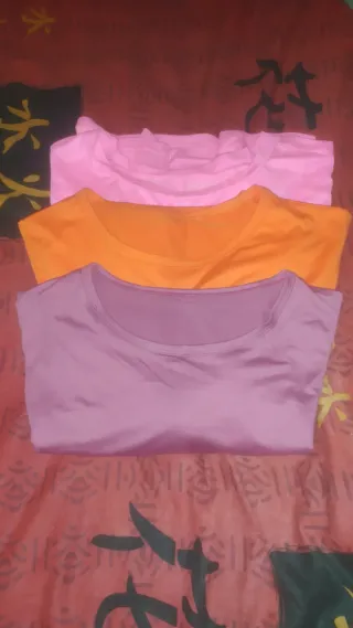 Conjunto de tres camisetas básicas, perfectas para el día a día. - Camiseta rosa. - Camiseta naranja. - Camiseta morada.