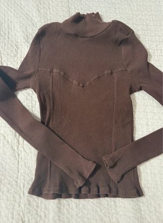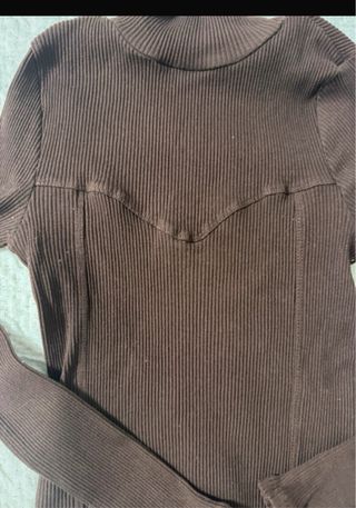 Camiseta de manga larga con cuello alto y tejido acanalado.Es ajustada y talla un poco pequeña - Diseño ajustado. - Detalle de costuras en forma de pico en el pecho. - Bajo con ligero volante
