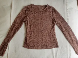 Elegante camiseta de manga larga con un delicado diseño de encaje. En la parte trasera y delantera lleva forro y no sé transparenta. Mangas transparentes. Totalmente nueva, solo 1 vez puesta