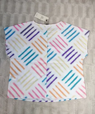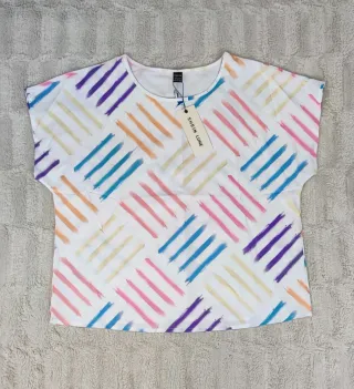 Camiseta fluida de la marca Sfera, talla S, pero es bastante amplia. Tiene las mangas tipo campana, es muy fresca y con una caída preciosa. En perfecto estado