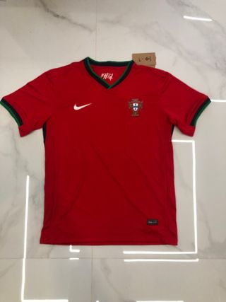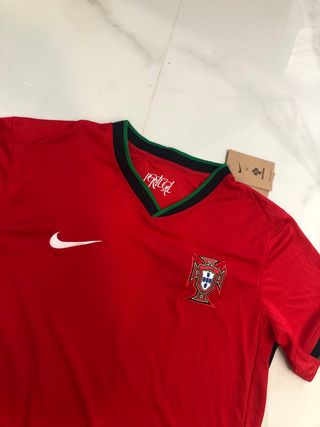 Camiseta de fútbol de Portugal de la marca Nike, en color rojo y con detalles en verde. Nueva con etiqueta. - Escudo del equipo bordado. - Logo de Nike en el pecho. - Cuello en V con ribete.