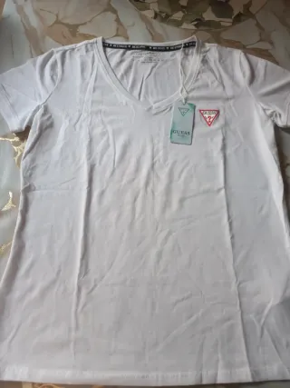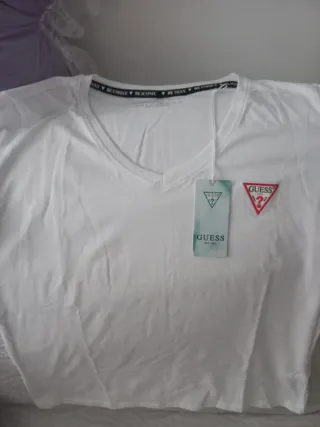 Camiseta Guess de color blanco, con etiqueta. - Cuello en V. - Logo de Guess en el pecho. - Banda con logo en el cuello.