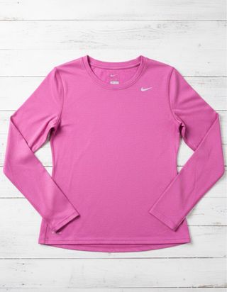 Camiseta deportiva de manga larga para mujer. Diseñada para la comodidad y el rendimiento. - Tejido ligero y transpirable. - Cuello redondo. - Logo de Nike en el pecho.