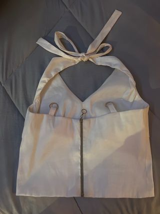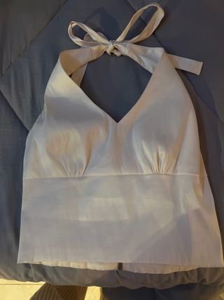 Camiseta blanca con diseño halter y escote en V. La parte superior presenta un fruncido sutil y se ajusta con un lazo en la nuca. - Diseño halter. - Escote en V. - Cierre con lazo en la nuca. - Detalle fruncido en el busto.