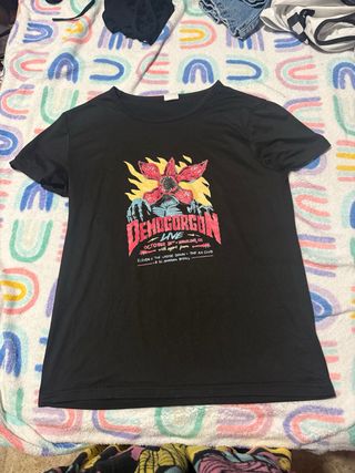 Camiseta negra con diseño de Demogorgon de Stranger Things. - Estampado frontal Demogorgon Live. - Incluye detalles de fechas y lugares del evento ficticio. - Inspirada en la serie Stranger Things.