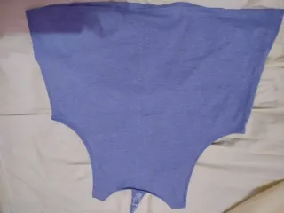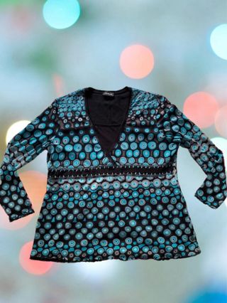 Camiseta con un estampado vibrante en tonos azules y turquesas. Presenta un diseño cruzado en el escote y detalles decorativos en la zona del pecho. 53 cm de pecho y 62 cm de largo