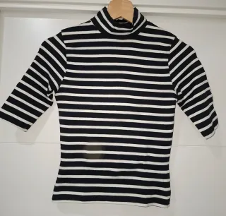 Camiseta de rayas con cuello alto y manga corta mide desde el hombro 28 cm. - Diseño a rayas blancas y negras. - Cuello alto. - Manga corta desde el hombro 28 cm. - Largo desde el hombro 48 cm - Ancho desde las axilas 34 cm - Ancho de hombro a hombro 30 cm.