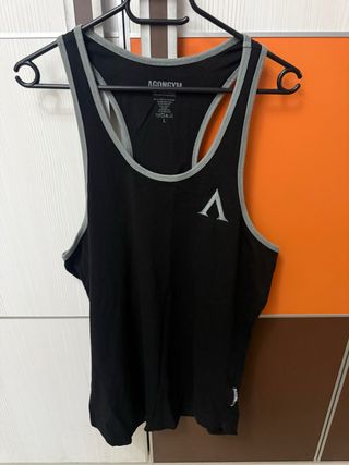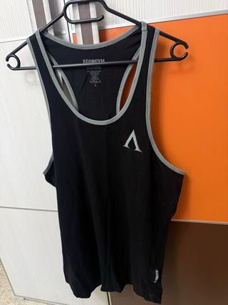 Camiseta de tirantes negra de la marca Agongym. Diseño deportivo con ribetes grises. - Logo de la marca en la parte frontal. - Logo de la marca en la parte inferior lateral.