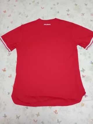 Camiseta de fútbol con diseño deportivo y detalles en los bordes de Zanzibar talla L - Medidas: 76x56 - Logo de Zanzibar en el pecho. - Bandera de Zanzibar en la manga. - Diseño con franjas blancas en las mangas. - Dobladillo con estampado de la bandera de Zanzibar.