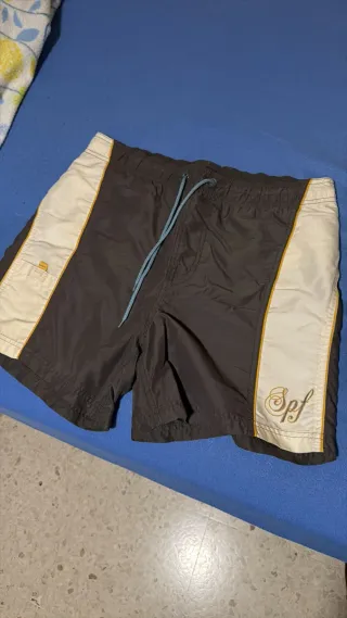 Bañador de la marca Springfield con un diseño moderno y detalles llamativos. - Paneles laterales en color beige con ribete amarillo. - Logo bordado en la parte inferior de uno de los paneles. - Cordón ajustable en la cintura. Camiseta XDYE talla XL de REGALO