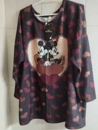 Se vende preciosa camiseta de Mickey Mouse para mujer. Color marrón con tonos rosas y beiges. Estampado con corazones de colores. Tejido muy calentito para el invierno. Talla 50. Sin estrenar, con su etiqueta. Precio 7 euros.