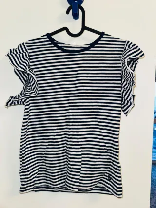 Camiseta de manga corta con un diseño de rayas clásico. - Cuello redondo. - Mangas con volantes. - Tejido de algodón suave.talla 12 años