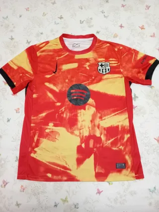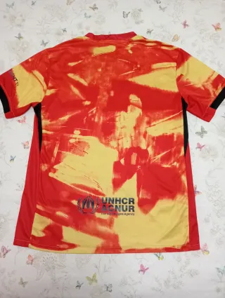 Camiseta de fútbol con un diseño llamativo en tonos rojos y amarillos. - Medidas: 73x51 - Escudo del equipo en el pecho. - Diseño abstracto y moderno.