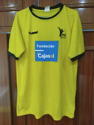 Camiseta deportiva de la marca Hummel, con diseño en color amarillo. Talla L En perfectas condiciones y muy bien conservada - Logo de Hummel en el pecho. - Inscripción IMD SEVILLA en la parte superior derecha. - Estampado Fundación Cajasol en el centro.