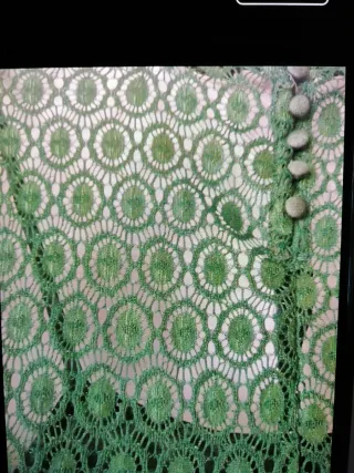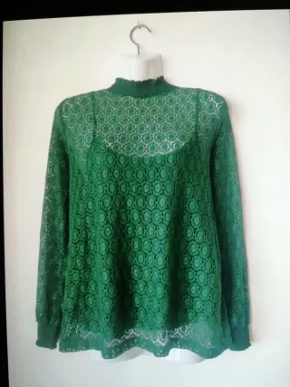 Camiseta de encaje elástica con un diseño de círculos con céntricos. Medidas: de axila a axila 52cm y largo 62cm. - Manga larga. - Cuello alto con volante. - Bajo con detalle de encaje. - Incluye top interior a juego.