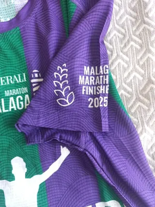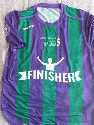 Camiseta técnica conmemorativa del Maratón de Málaga. - Diseño a rayas verdes y moradas. - Inscripción Finisher en el frontal. - Logo de Generali y 42K repetido en el tejido.
