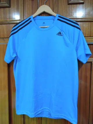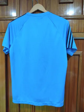 Camiseta deportiva de manga corta con el icónico diseño de tres rayas en los hombros. Talla M En perfectas condiciones y muy bien conservada - Diseño de cuello redondo. - Logo de Adidas en el pecho. - Tejido técnico transpirable.