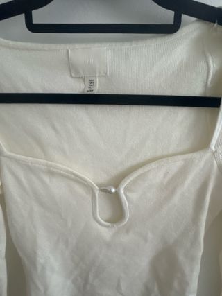 Camiseta de manga larga con un diseño elegante y moderno. - Escote pronunciado con detalle de perla. - Tejido de punto acanalado. - Corte ajustado.