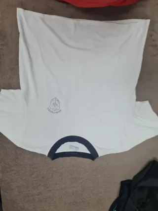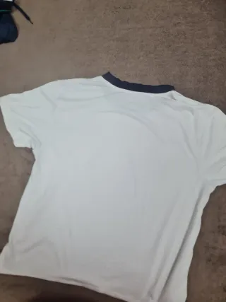 Camiseta de manga corta con detalles en contraste. Talla XL o L Tiene alguna mancha que se puede observar en la última foto En buen estado y bien conservada - Cuello redondo con ribete azul. - Mangas cortas con puños en contraste. - Logo de Joma en la manga y en la parte inferior.