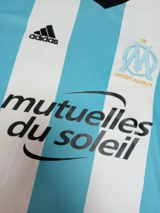 Camiseta de fútbol del Olympique de Marseille talla M - Medidas: 74x50 - Diseño a rayas verticales blancas y celestes. - Cuello en V negro con detalles de las tres franjas de Adidas. - Inscripción Mutuelles du Soleil en la parte frontal.